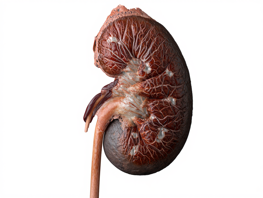 "Crystallized toxins and mineral deposits blocking kidney filtration systems"